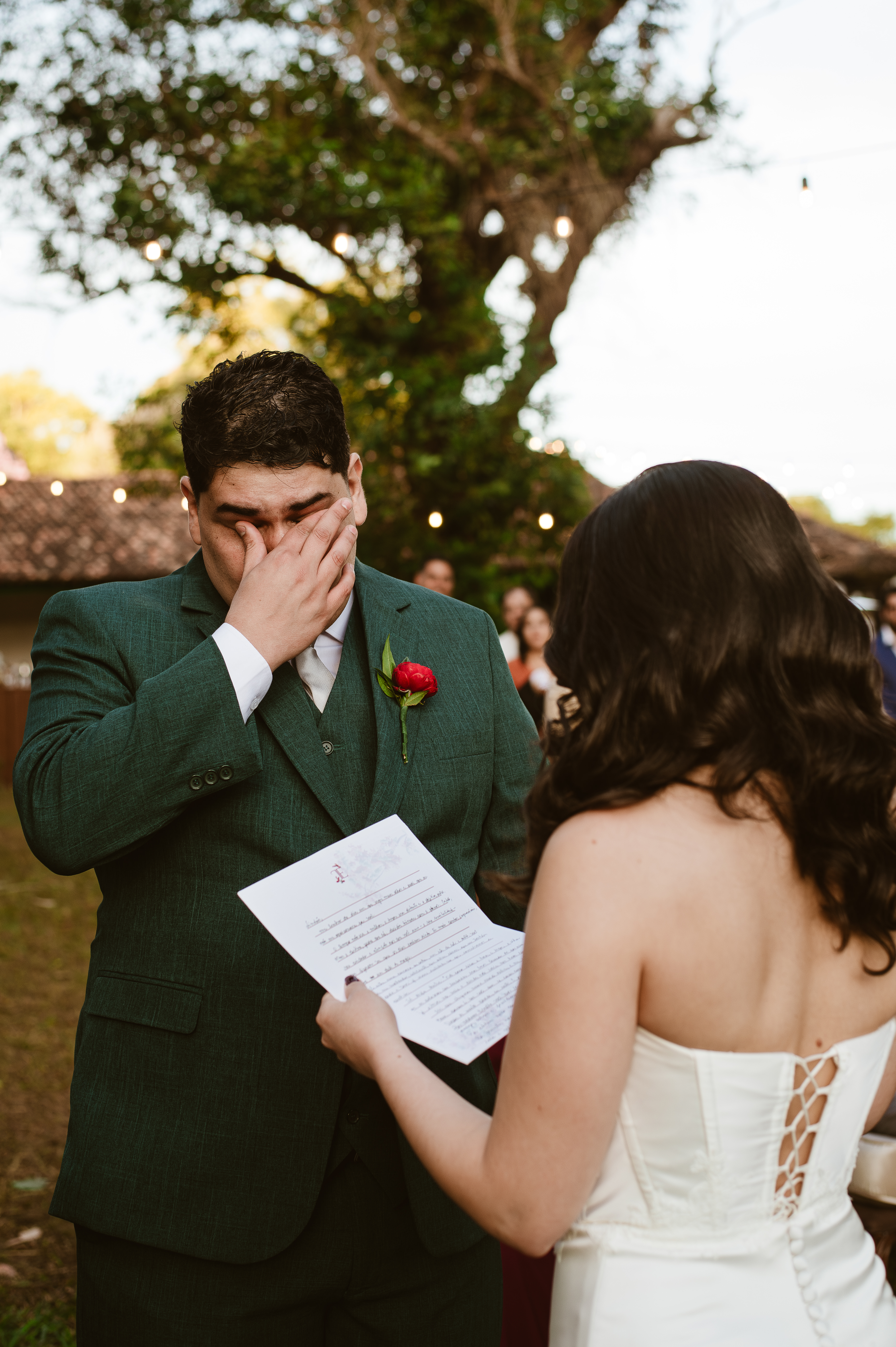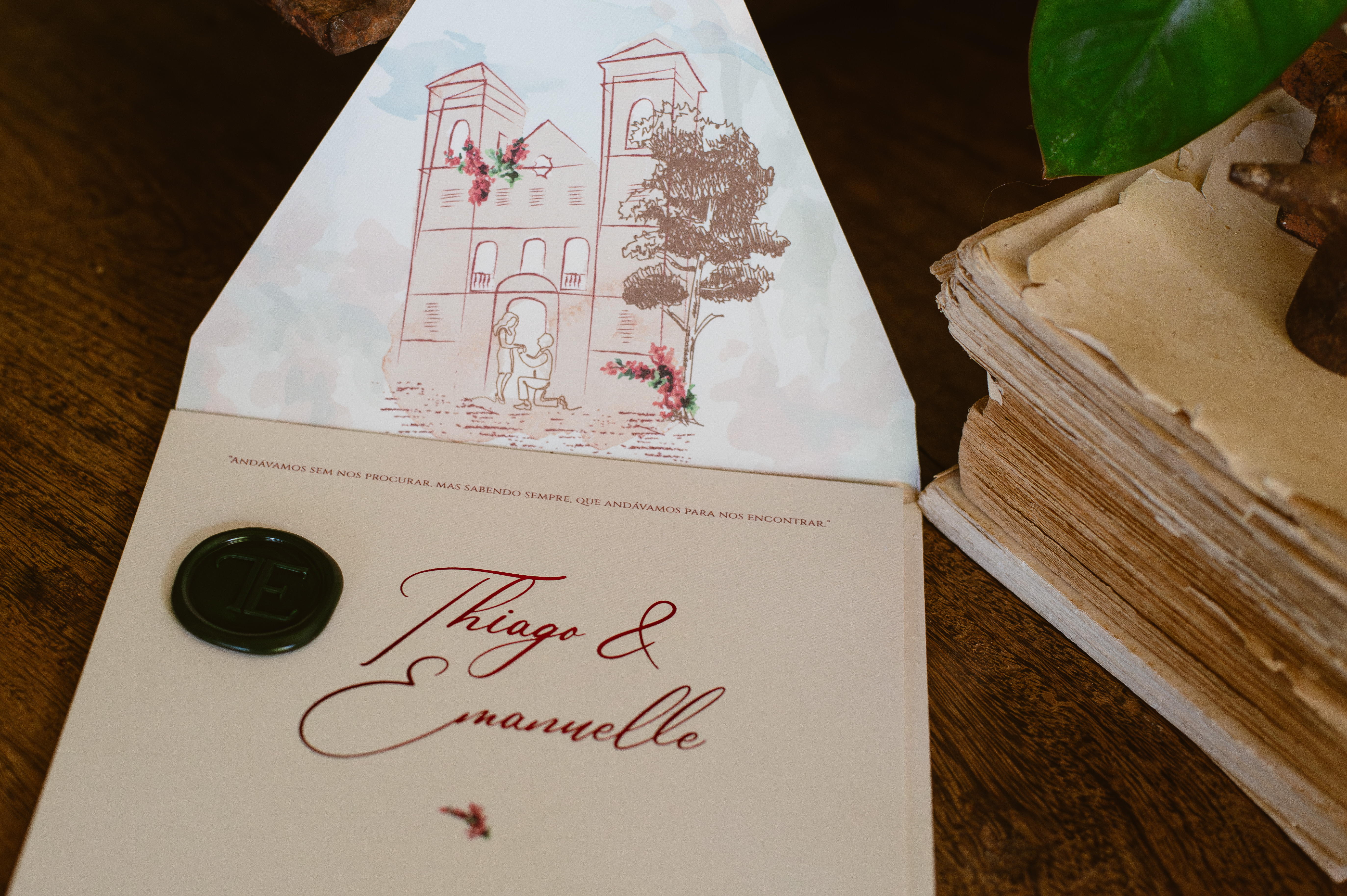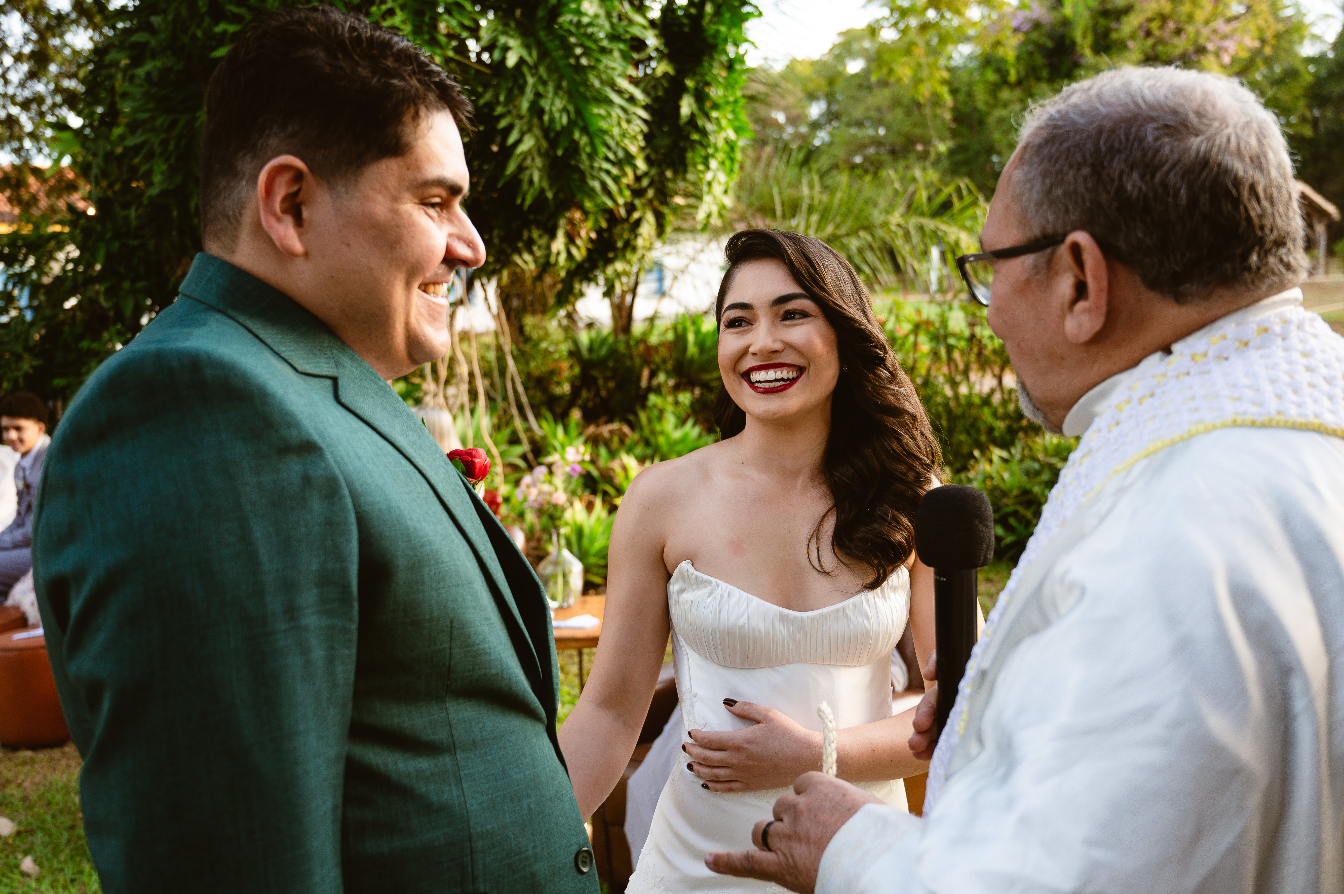 A cerimônia, celebrada pelo Padre Bernardino, foi leve e comovente. Apenas um casal de padrinhos, irmãs e amigas como damas, cada uma com a própria cor. Um sobrinho levou um bastidor bordado com um poema que Thiago havia escrito aos nove anos, sem saber da surpresa. As alianças estavam em um terrário com terra fértil, simbolizando o compromisso que criaria raízes.